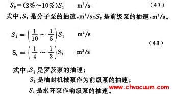罗茨泵作为主泵时,由于罗茨泵的转子与转子、转子与定子之间的间隙较大,所以它对气体的压缩比较小,一般其前缀泵要大些。通常可用油封机械泵或水环泵作为罗茨泵的前级泵,前级泵的抽速可根据经验公式(48)选取。