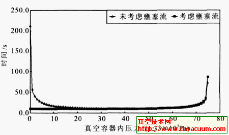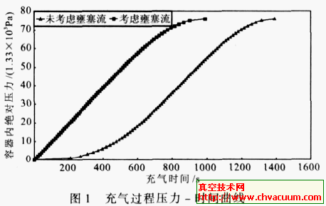 由图2可知,两种计算方法在充气后半部分(真空容器压力大于临界压力)充气速率几乎相等。而刚开始充气时相差较大。当未考虑壅塞流时,刚开始充气时压力每上升1333.22Pa充气时间超过200s,随后逐步缩短到10s左右,这显然不符合常理。从而证明了本文计算公式的合理性。