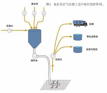 三缸/五缸往复式活塞和柱塞泵用于输送水、砂砾和添加剂的混合液。Gardner Denver、Weir SPM、Schlumberger、Quinn Pumps、CAT、Ruhrpumpen 和 National Oilwell Varco公司是生产这些泵的主要供应商,泵的工作压力范围高达45,000 psi。Weir SPM公司称,它为Barnett页岩提供的油气井工作泵比任何其他泵生产商都多。这些泵安装在卡车上,每个井口处都有很多泵。
