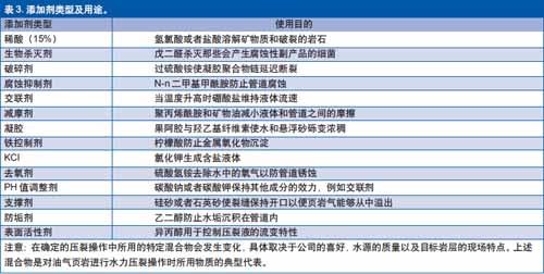 压裂过程所用的水(压裂水)中要用到一些添加剂。这些添加剂存储在井场的压裂罐中,需要使用计量泵将它们添加到注入水中。每种添加剂都有其特殊的用途,添加的量也各不相同。聚合物用于减小注入水内部的摩擦,生物杀灭剂用于杀灭压裂水中那些会导致管道腐蚀及H2S滋生的细菌。一家供应商报告称,每1000加仑的压裂水需要8-25加仑生物杀灭剂,大约相当于总流量的1%到2%。但是,关于压裂液添加剂的估算数据差别相当大,造成这种差异的部分原因是钻井公司将他们所用的添加剂以及每种添加剂的用量视为商业机密。表3列出了大部分添加剂类型以及它们各自的用途。