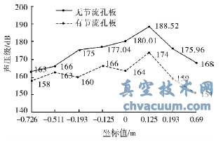 路过仿真模拟计算方式,需要受到沿x轴载面区域划分不均的七个不同的点的声压级查测结杲。出口贸易无节流孔板和增高节流孔板时,较小压力下轴径装置点声压级区域划分不均曲线拟合图见图6。