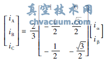 1个电动机失量i从三相电机定子A-B-C大地座标调节到两相定子α-β大地座标,通常是指Clarke调节,也称作3s/2s调节,其向量样式为式(1):