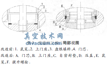1)争对阀块冲蚀做出补焊整理。补焊前先抓好打磨抛光、环保等工做;补焊时由下致上多层次合成。补焊截止后做出必要的的上色探伤,避免纹裂等熔接通病。最后用专门镗床粗车阀块密封隔绝面后医治至原大小。用研磨抛光APP各是精研上阀块及门芯,并彼此之间吃线通过率。 2)上阀球的结构会根据自抽真空盖蝶阀行式对其进行处理。将上阀球盘根处理为加设自抽真空盖垫子,还有就是在上阀球上侧开立4×M16的底孔用到提拔应用。在上阀球与鼠笼两者使用自抽真空盖销钉的同時开立4×Φ17提拔地脚螺钉螺母孔,这样的就养成倒吊式的自抽真空盖,蝶阀启用时上阀芯与上阀球学习并向前增加,自抽真空盖上移并体现了抽真空盖帮助。蝶阀闭合时原因提拔地脚螺钉螺母帮助上阀球不下跌,清除了因阀芯回转式中长跑后鲍尔环规整填充料暴露的将会,如3一样。同時将门盖地脚螺钉螺母由原M42(35#钢)所选材质增加至42CrMo,在使用中先应用专业级用具将上阀球上提,减少鲍尔环规整填充料的预紧力,如果紧固连接好门盖的压紧地脚螺钉螺母,持续改善以上全用压紧地脚螺钉螺母给鲍尔环规整填充料环增加预紧力的情况报告。