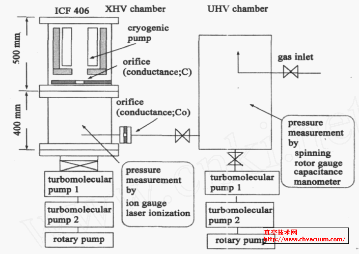 压力衰减法是将气体通过微调阀引入到超高真空室,再通过一分子流流导很小的小孔流入到XHV校准室,达到平衡时,用磁悬浮转子规或电容薄膜规测量UHV 室中的较高压力,通过计算得到XHV校准室中较低压力。