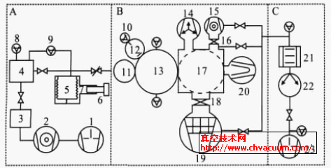 A.流量计系统;B.校准和主抽气系统;C.前级抽气系统;1,23.机械泵;2,15.涡轮分子泵;3.稳压室;4.基准室;5.可变容积;6.活塞;7.油室; 8.ACDG; 9.DCDG ;10.裸规;11.进气室;12.裸规室;13.校准室;14.离子泵;16,18.插板阀;17.抽气室;19.低温泵;20.钛升华泵;21.冷阱;22.罗茨泵