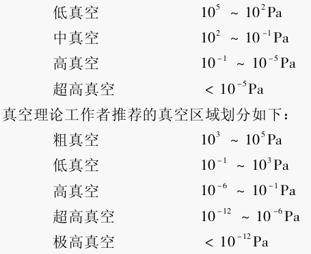有了量度真空度的单位,就可以定量地表示真空度的高低。但是,目前真空技术所涉及的压力范围已宽达20个数量级,为了使用方便,有时只需要粗略指出真空度的大致范围,通常定性地把真空粗略划分几个区域。划分区域的依据主要考虑真空状态下气体分子运动的物理特性、真空泵和真空计的有效工作范围等。