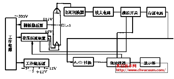 电离规是按照其实验室的气体电离与实验室的气体强度相等而制出的。在比较紧固形式和比较紧固电压降的必要条件下达射电压量ie,收录电压量i+ 和真空装置装置中的压强P 有似下内在联系 i+=kieP(1) 式中 k通常是指规管的灵敏性度。它的结构类型特征类同于电子厂无线三级管。灯丝供暖阴离子, 电子厂无线有激光能量在静电场使用下, 分离阴离子跑向栅极。各极的输出功率和规管的结构类型特征直接决定了规管的常数 , 如DL-5的k=0.015A/Pa。阴离子电流电压电流的宽度与供暖灯丝输出功率紧紧关联。选择电离规管的基本特征, 自动化自测图片仪电路系统的开发由: 片式机与表现这部份、闭路调节系统的、采集自测图片这部份和各直流电电源线等四这部份所结构, 基本带来如下图表达1 表达。后面 分为,之。2、单片机与显示部分