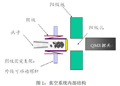 本实验系统组成部分有:真空系统、四极质谱计、光学高温计、计算机、阴极加热电源。四极质谱计为德国Pfeiffer公司的PrismaTM Quadrupole mass spectrometer(QMS 200)。采用光学高温计测量阴极的温度,型号为WGG2-201。真空系统结构如图1 所示: