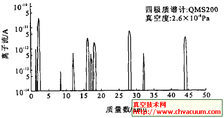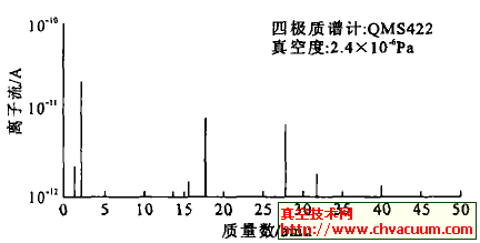 回收利用四极质谱计的的残留物甲烷气体介绍检漏对超高真空系统抽气并达到极限真空后,用四极质谱计的棒装谱扫描方式扫描残余气体谱图,见图1。主要成份为H2,H2O,N2(CO) ,O2和Ar,N2和O2的比例大约为4∶1, 证明真空系统有微小漏气。