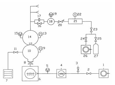 式中 P2为校准室压力;P1为磁悬浮转子规⒆所测压力;R为小孔17和 小孔12的流导比,约为103左右,不确定度小于1%。衰减压力的分子流动态进样法可实现校准室在10-6~10-4Pa范围内的校准,该方法对单一气体的测量不确定度为4.2%。