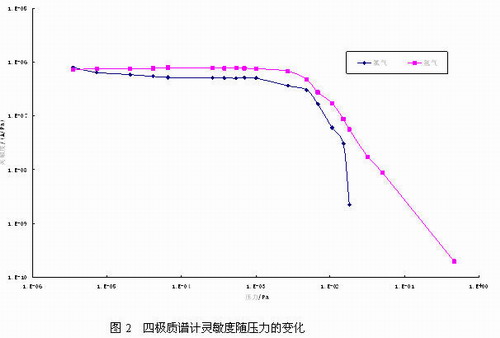 通过实验检测,在高压力下,四极质谱计灵敏度偏离线性的主要原因除了离子与气体分子和离子碰撞导致离子损失外,离子间电荷的作用力使离子发生散射也是一个重要的原因。数据表明,在高压力下,通过式S=S0·еbp 计算所得压力值与标准压力值的一致性比较好,而通过离子流与线性灵敏度S0比值得到的压力值与标准压力值存在很大差异,在10-1Pa,两值之差达几个数量级。