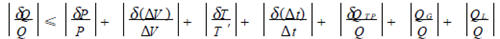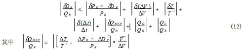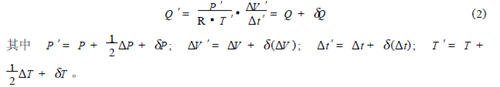 假设测量起始时参考室的压力和温度分别为PR和TR , 测量结束时参考室的压力变化量和温度变化量分别为△P R 和△T R , 变容室相对于参考室的压力差变化量为△ (DP) ,参考室压力的测量误差和差压式真空规的测量误差分别为δPR 和δDP; 流量的测量值Q′仍用式(2) 计算, 但其中的P ′为
