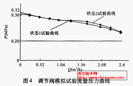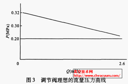 根据系统提供的参数, 系统油泵提供燃油的流量恒定为3.3 m3 /h, 燃机的最大用油量为2.6 m3 /h。当燃机的用油量最大时, 其进口处的压力不能低于0.18 MPa。燃机停机时, 进口处的压力不能高于0.32 MPa。由此确定了设计的理论参数。当燃机用油量为2.6 m3 /h, 经过调节阀的调节, 使燃机进口处的压力≥0.20MPa。当燃机在紧急情况下停机时, 燃机进口处的压力≤0.32MPa (图3) 。即无论燃机进口处的流量值是多少, 燃机进口处的压力维持在0.20~0.32 MPa之间, 就能满足系统的要求。