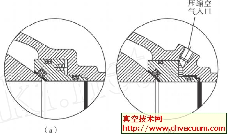 (a) 螺旋弹簧预紧 (b) 减小空气的进一步推动图3 密封面自动补偿结构