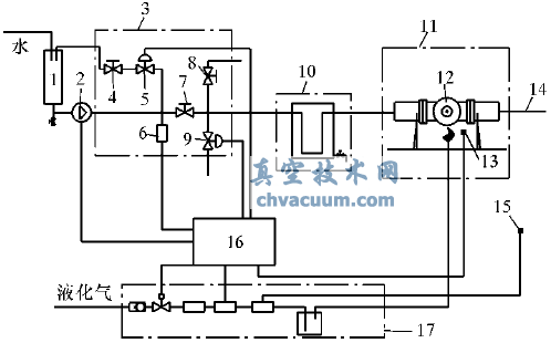 11)一氧化碳冷却系统;12)被试球阀;13)铂热电阻;14)蒸汽加热输油管线;15)管道煤气调节器器;16)操纵柜;17)管道煤气操纵柜。