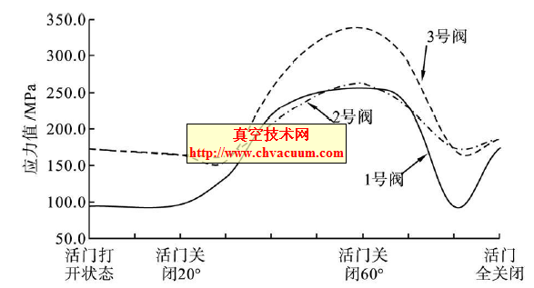 通过对球阀动水关闭有限元应力分析得出, 球阀球体关闭约60度时, 球阀承受的应力最大。因此球阀进行有限元分析时, 不仅要考虑球体全关闭工况, 还要考虑球体在60度状态时的应力水平。